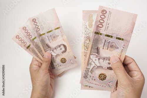 Hands Counting Money in Thai Banknote, 5 Thousand baht, The current economy should spend carefully.