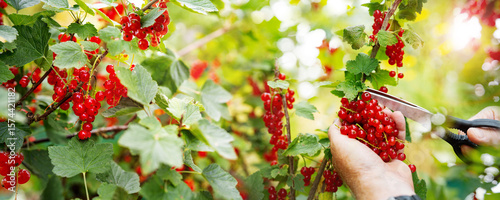 Hands harvesting red currants in the garden. Male hands cutting fresh red currants from a bush with scissors. Sunny horizontal close-up with bokeh.