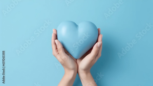 Hands hold a blue heart. Created with Generative AI technology.