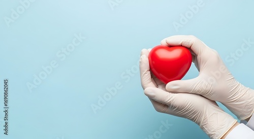 Hands holding a red heart on a blue background.