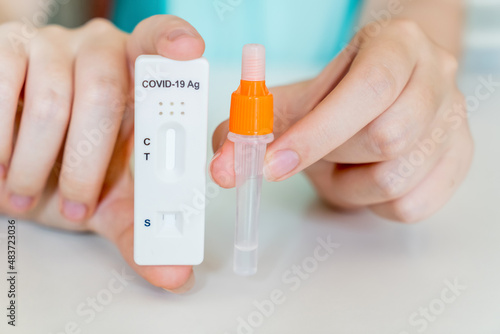 Hands holding Covid-19 rapid antigen test kit ready to use. Tube and test cassette with specimen