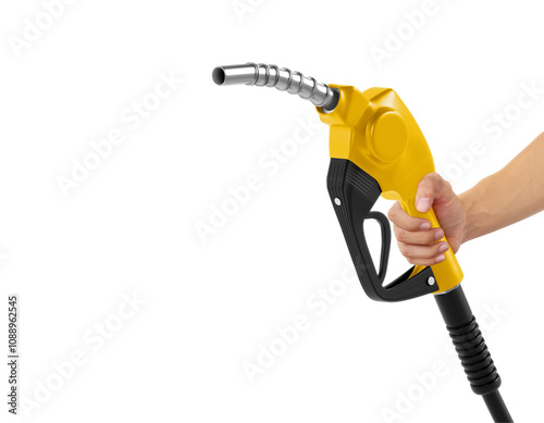 Hands holding Fuel yellow nozzle, transparent background