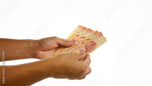 Hands holding mexican pesos over an isolated white background, showcasing money in mexico.