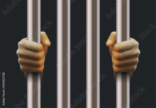 Hands holding prison bars. Sentenced behind jail cage bars, punishment for illegal action. Imprisonment arrest and deprivation of liberty. Prisoner, justice and criminal law concept 3D vector concept.
