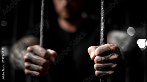 Hands of a shadowed man extended through prison bars, tattoos visible, low-key lighting creating dramatic contrast with dark figure in background