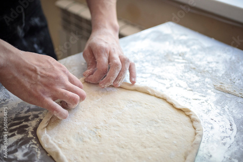 hands of the cook kneading pizza dough close-up