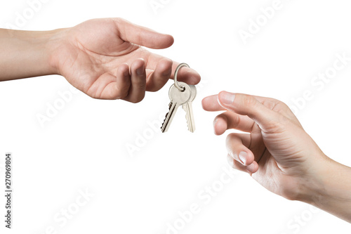 Hands of two people, giving and taking keys, isolated on white background