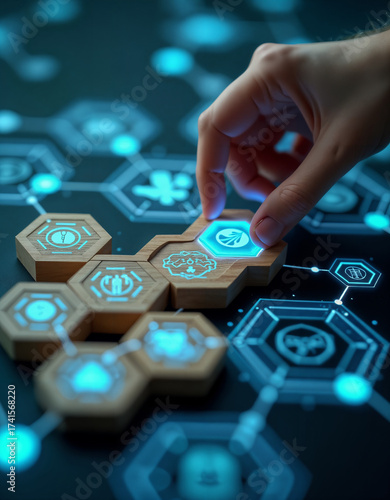 Hands Selecting Digital Strategy Icons on Futuristic Interface Representing Business Innovation