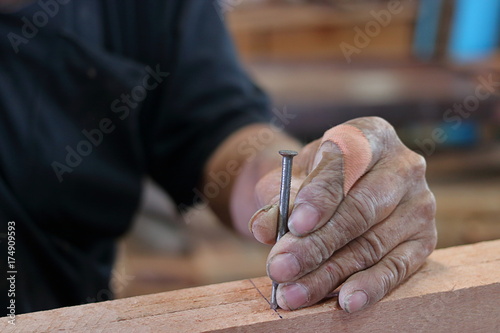 Hands senior carpenter holding nail on wooden piece with copy space.