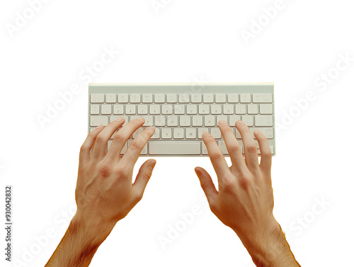 Hands typing on a white keyboard isolated on yellow background. PNG transparent.