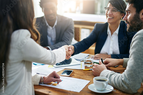 Handshake, women and finance in office for deal, agreement and proposal or interview at desk. Accounting team, collaboration and approved transaction with people at work table, strategy or networking