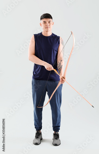 Handsome Asian archer with bow on light background