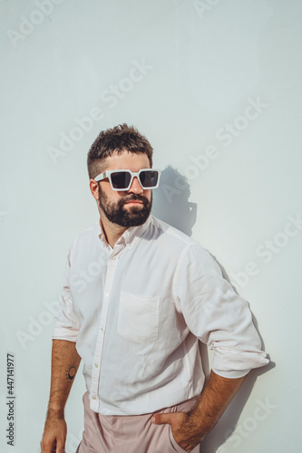 Handsome beard man posing in the street, near with wall, sunglasses, hipster style, outdoor portrait, fashion model, happy face,