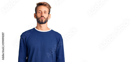 Handsome blond man with beard wearing casual sweater looking at the camera blowing a kiss on air being lovely and sexy. love expression.