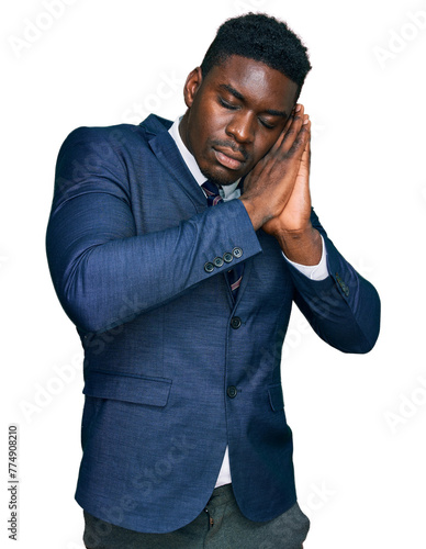 Handsome business black man wearing business suit and tie sleeping tired dreaming and posing with hands together while smiling with closed eyes.