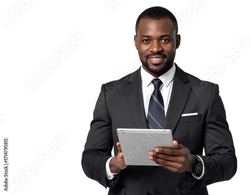 Handsome businessman using a tablet and working, isolated on transparent background.