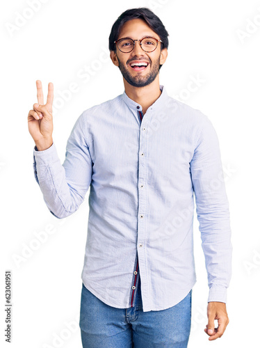 Handsome hispanic man wearing business shirt and glasses smiling looking to the camera showing fingers doing victory sign. number two.