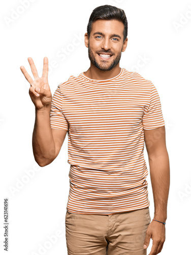 Handsome hispanic man wearing casual clothes showing and pointing up with fingers number three while smiling confident and happy.