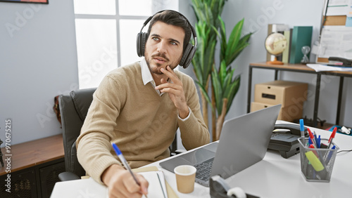 Handsome hispanic man with beard wearing headphones in an office looking pensive.