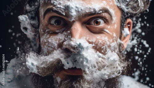 Handsome man enjoys winter freshness, washing with bubbly snow foam generated by AI