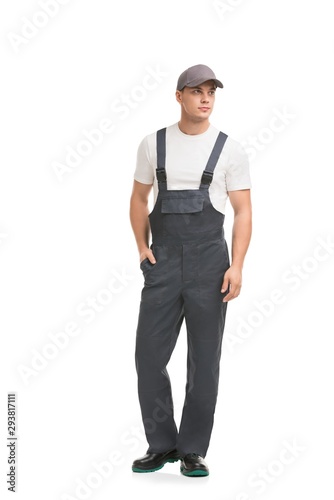 Handsome man in gray work overalls view