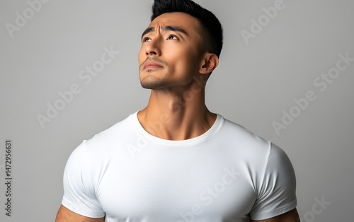 Handsome Man in White T-Shirt Looking Upward