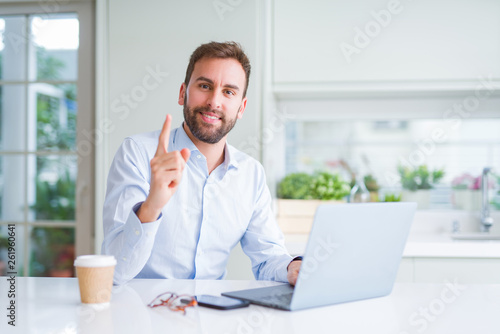Handsome man working using computer laptop and drinking a cup of coffee very happy pointing with hand and finger to the side