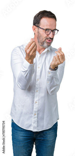 Handsome middle age elegant senior business man wearing glasses over isolated background Doing money gesture with hand, asking for salary payment, millionaire business
