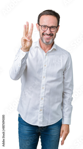 Handsome middle age elegant senior business man wearing glasses over isolated background showing and pointing up with fingers number three while smiling confident and happy.