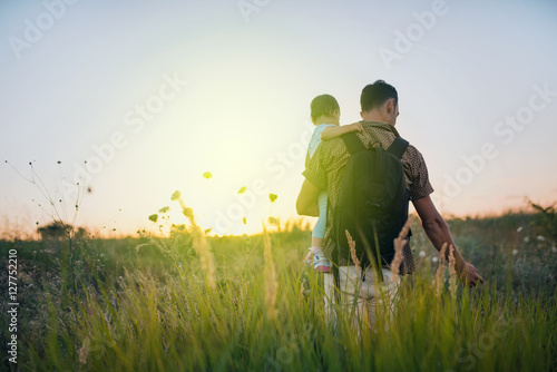 Handsome young father on his hands with his cute toddler daughter outdoor. Dad playing with his child at nature. Happy family spending time together outside at meadow and on sunset.