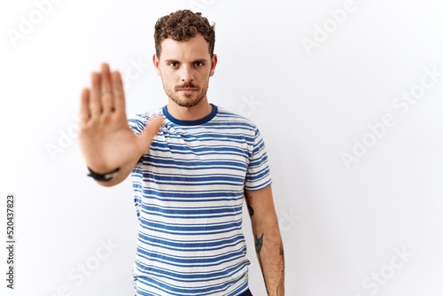 Handsome young man standing over isolated background doing stop sing with palm of the hand. warning expression with negative and serious gesture on the face.