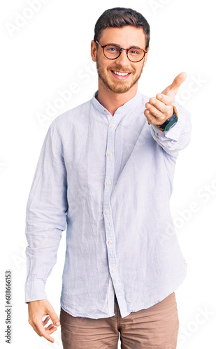 Handsome young man with bear wearing elegant business shirt and glasses smiling friendly offering handshake as greeting and welcoming. successful business.