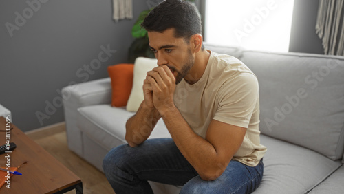 Handsome young man with beard in jeans and t-shirt sitting thoughtfully on a sofa in a modern living room filled with natural light