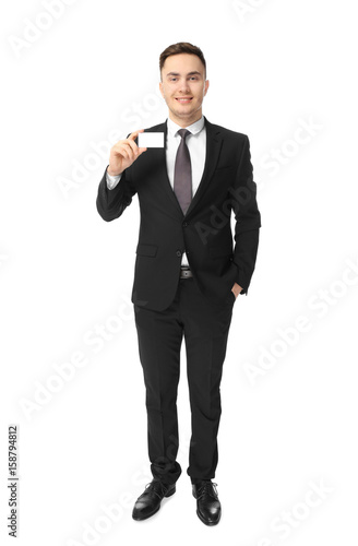 Handsome young man with business card on white background