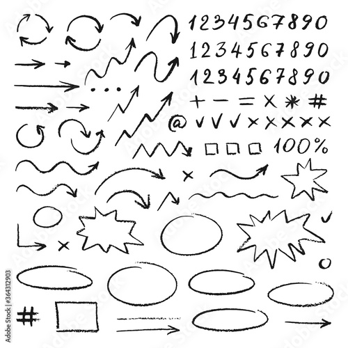 Handwrite elements on white background. Numbers, arrows, symbols and signs