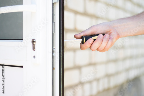 Handyman repair and installing lock in plastic front door in house.