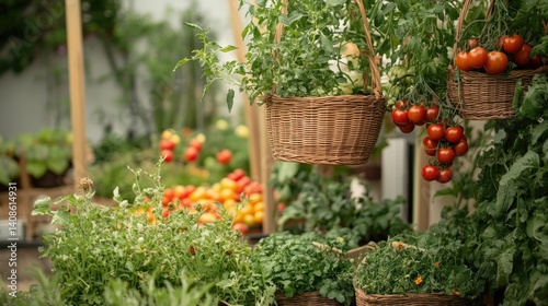 Hanging Baskets of Ripe Tomatoes in a Greenhouse