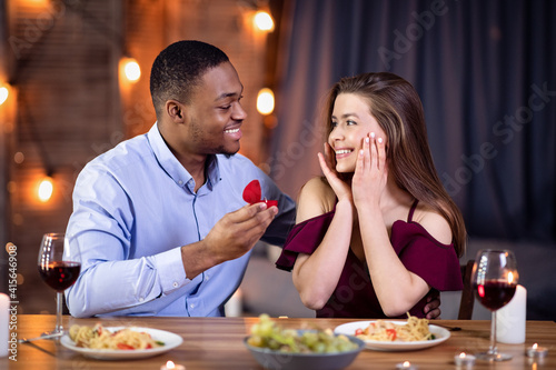 Happy African American Man Making Proposal To His Surprised White Girlfriend
