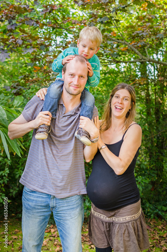 Happy beautiful family with pregnant mother at the park