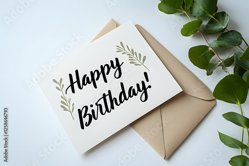 happy birthday card with a minimal botanical design placed on a kraft envelope, accompanied by fresh eucalyptus leaves on a light background