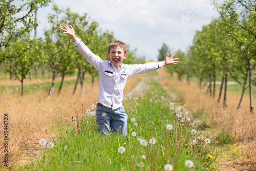 Happy boy rejoices in the spring garden. School summer holidays have begun.