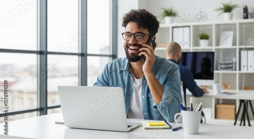 Happy businessman working: man on phone call with laptop in modern office - business, communication, technology, and success concepts for professionals (image)