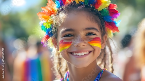 Happy child at a pride parade, adorned with bright rainbow tribal face paint, celebrating diversity and back-to-school season, colorful festival in background