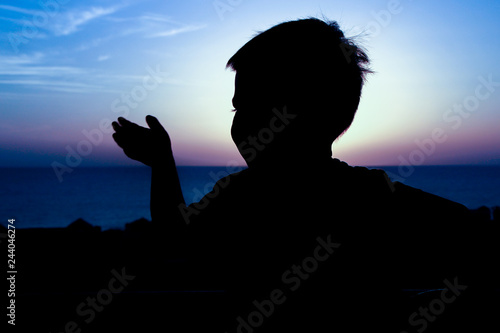 Happy child at the time of the silhouette of the sea background