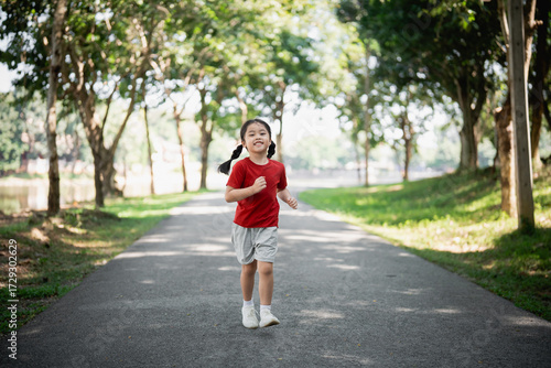 Happy Child Running in Park Pathway Surrounded by Green Trees, Enjoying Outdoor Activity in Bright Daylight with Joyful Expression on Face