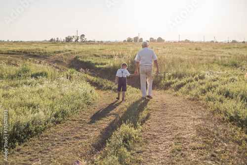 Happy child with Grandfather playing at the meadow. Grandpa retiree. Retirement parent