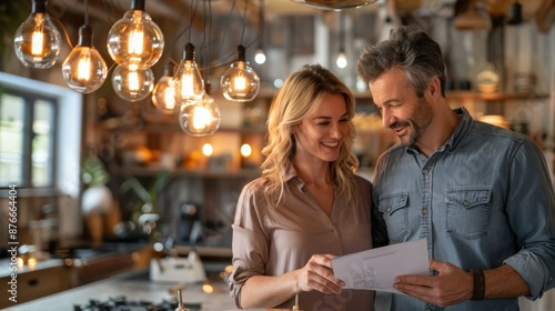 Happy Couple Discussing Kitchen Remodel Plans Under Warm Light Bulbs.