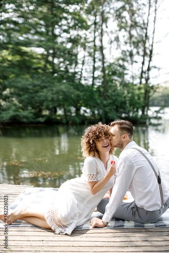 Happy couple have a rest in the park near the lake on a picnic. A couple sits on a plaid blanket on a picnic near a meal