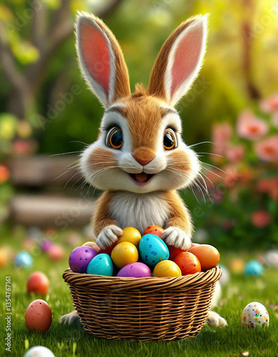 Happy cute Easter rabbit with eggs. Realistic cartoon personage.