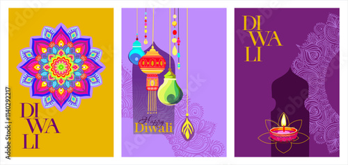 Happy Diwali!Festival of Lights.A set of ready-to-print posters of stylized Indian ornaments(mandalas),an oil lamp with a welcome text in bright festive colors.Fully editable digital illustration flat